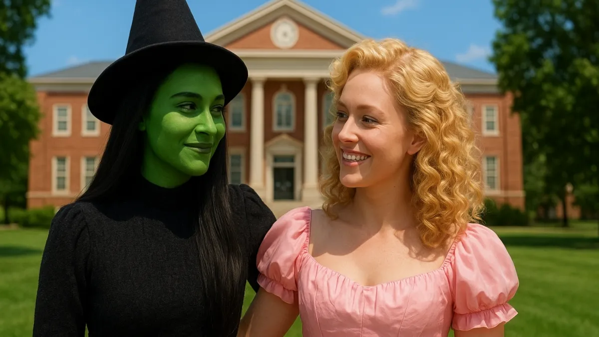 Exploração da amizade entre Elphaba e Glinda, o pano de fundo universitário em Shiz e a visão de Jon M Chu para Oz em cena. Elphaba Glinda amizade Universidade Shiz…